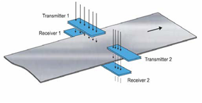 2つの電磁誘導センサが同一平面上に、パスレベルに対して垂直に、ラインセンターに対し対称に配置され、測定を行っております。