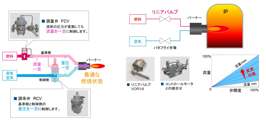 バーナーを効率よく最適な燃焼状態で維持するためには、一次圧が変動しても燃料の流量を一定に保ち、燃料の圧力と噴霧気体(蒸気や空気)の圧力差を一定に保つ必要があります。